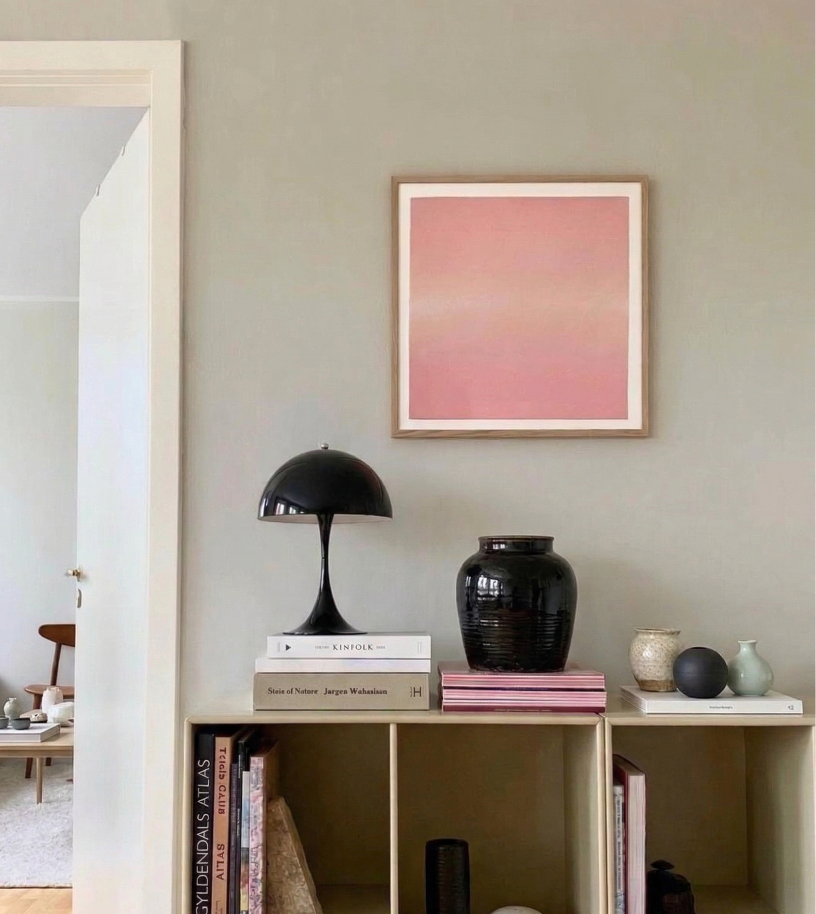 Et marokkansk gulvteppe, stuebord i reclaimed wood, en dekorativ garden stool, duftlys og terrakotta-detaljer skaper en lun stue med en tidløs grønn veggfarge og rolige, nøytrale toner.