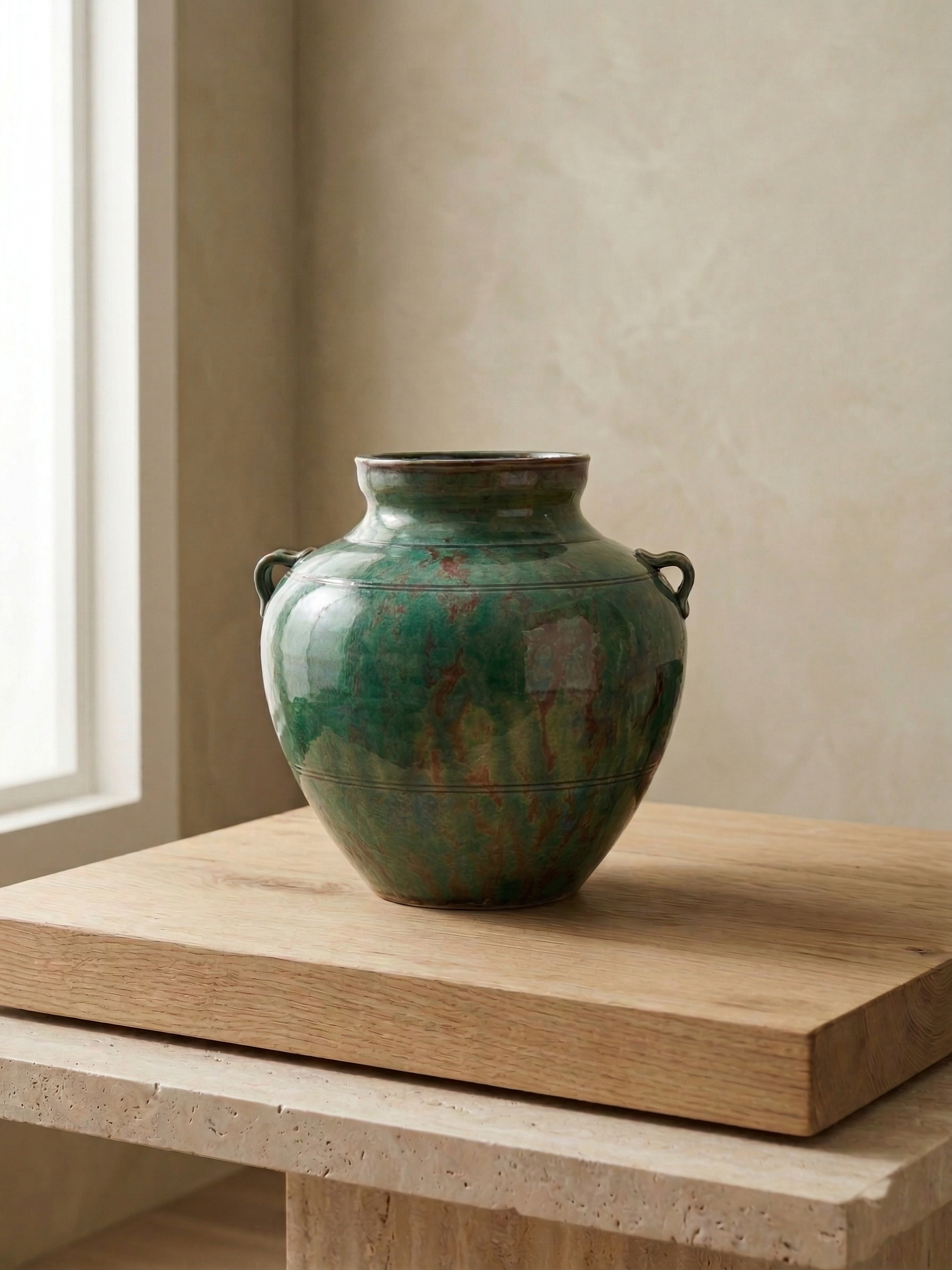 Reclaimed wood, marokkansk teppe og en Fez-figur – en kombinasjon av rå teksturer og skulpturelle detaljer.